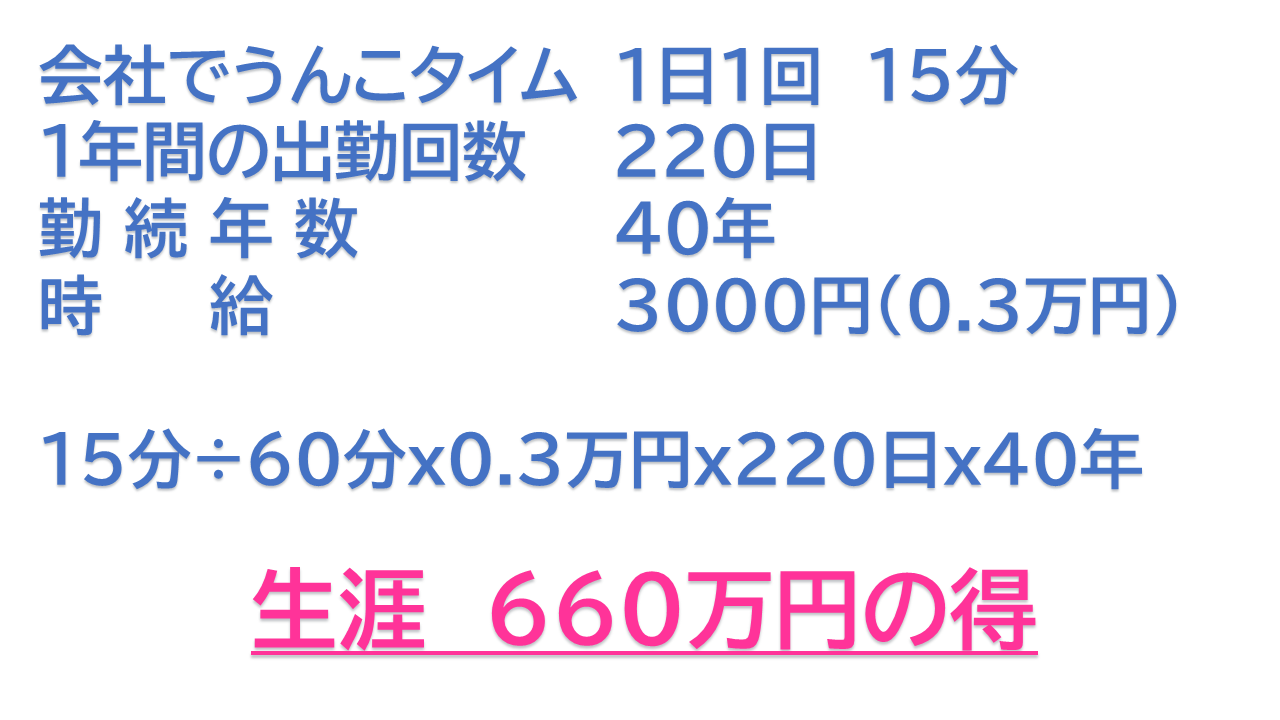 なぜなら、トイレにこもっている間も、時給は発生中!つまり、座っているだけでお給料がチャリンチャリン。しかも、トイレの水道代も紙代も、すべて会社持ち。自宅でやれば自腹なのに、会社ならタダ!なんという経済的な時間!