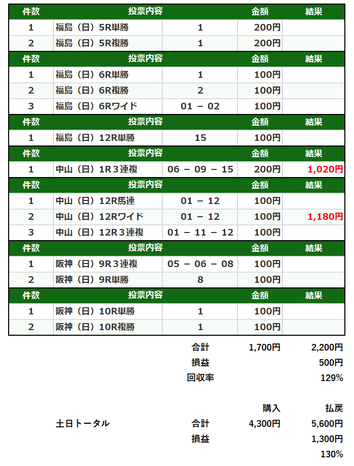 日曜の馬券 🎯129% 7戦2勝