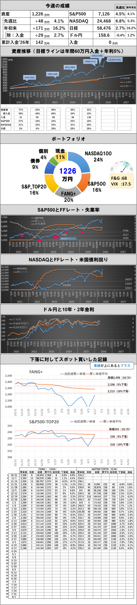 悪いニュースで下げたときには、継続的に株を買えば、その後の上昇で儲かるのが株式市場のルール。下段の表に示した、昨年10月から毎週買い増してきたFANG+とSP20の軌跡。今週すべて利益に変わった。